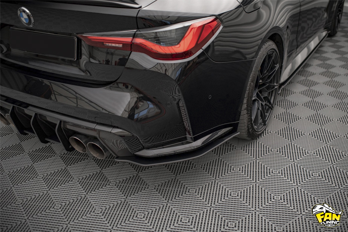 Обвес на БМВ М4 G82 состоит из сплиттеров, которые устанавливаются под бампера и пороги, а на задний бампер ставится объемная и агрессивная накладка.