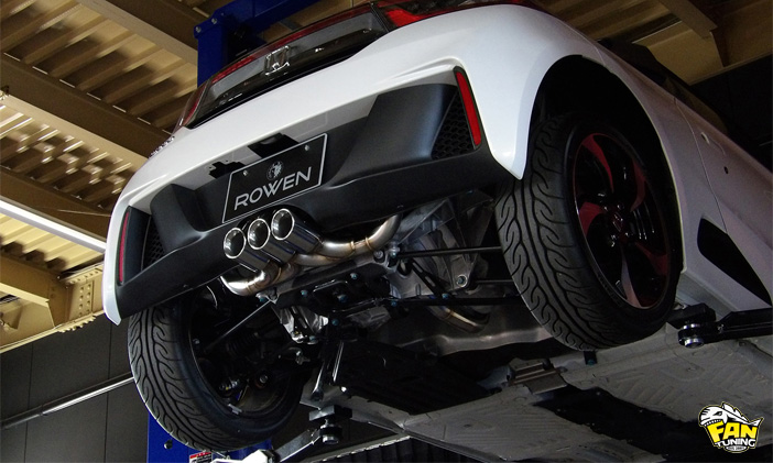 Японцы из Rowen предлагают не только обвес, но и выхлопную систему с насадками глушителя из нержавеющей стали или из титана крутого синего цвета.