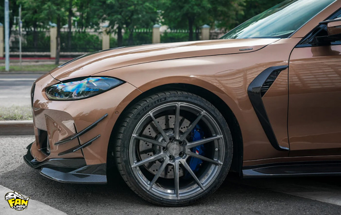 Отличное дополнение к внешнему виду BMW M3 G80 - карбоновые окантовки жабер передних крыльев, причем не важно ставятся ли они совместно с другими карбоновыми элементами или устанавливаются как отдельные детали. В любом раскладе взгляды будут прикованы к ним. Можно их выбрать в плетеном, классическом варианте или в кованом карбоне.
