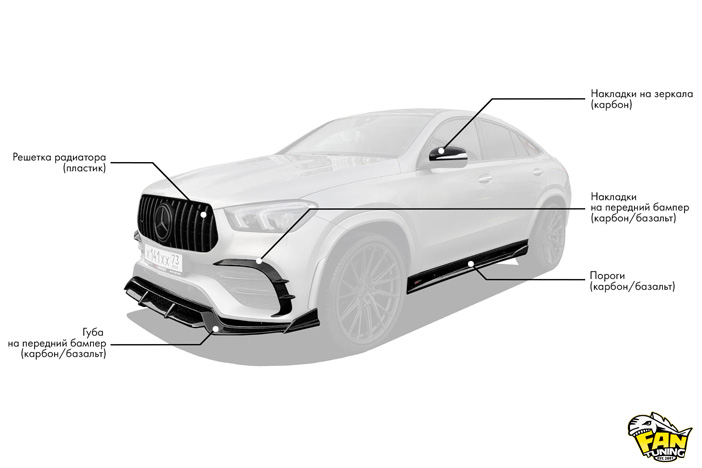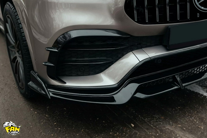 Если вы хотите купить обвес на Мерседес (Mercedes) GLE Coupe C167, в котором будет немного переделок, но чтоб автомобиль эффектно отличался от своих собратьев, то я рекомендую обратить внимание на тюнинг комплект Ренегат. В нем не нужно менять целиком бампера - на передний бампер ставится накладка, меняется задний диффузор, устанавливаются пороги и два спойлера на багажную дверь. Да, чуть не забыл про накладки на передний бампер и решетку радиатора в стиле AMG GT с вертикальными планками.