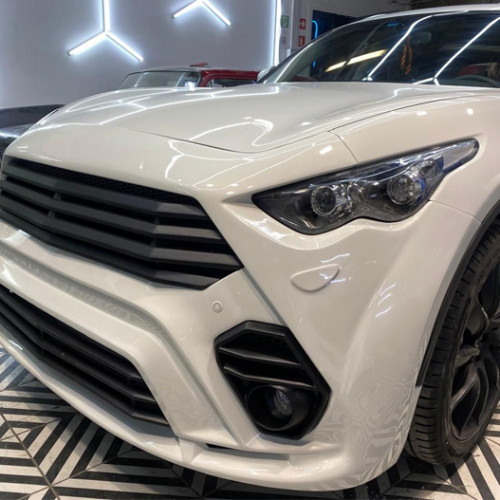 Владелец решил не просто сделать кузовной ремонт, но и преобразить внешность своего Инфинити. Был выбран бампер Ренегат в легкой версии (без расширения), куплено новое крыло и расширитель колесной арки. Мы всё это собрали, окрасили в белый перламутр (достаточно сложная трехслойная покраска) и установили на автомобиль.
