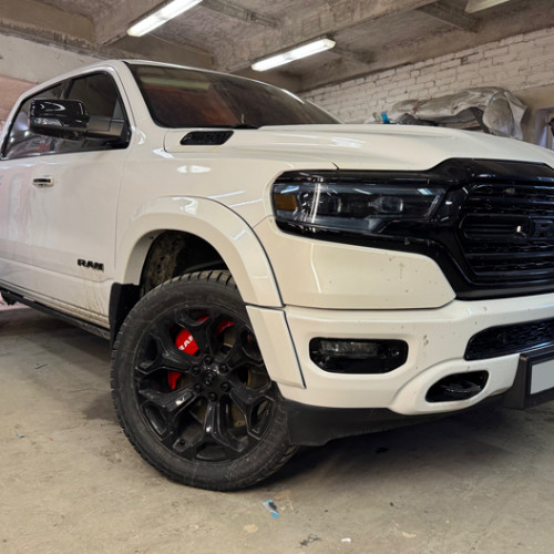 Мы много устанавливаем и отправляем в другие города наши расширители колесных арок на RAM 2018 модельного года. Мы их спроектировали так, что не нужно сверлить кузов, они устанавливаются на штатный крепеж. А также мы сделали продолжение расширителей на передний бампер. Кстати, мы спроектировали расширители колесных арок и на RAM 2025 модельного года.