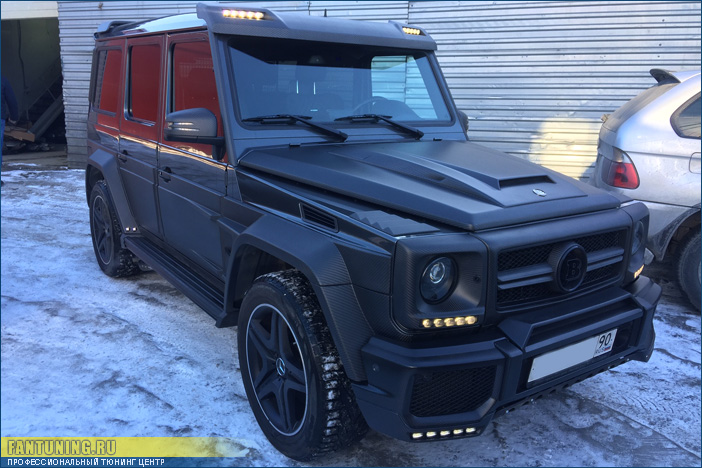 Приехал к нам интересный Гелик (G-Класс) в обвесе Брабус (Brabus) WideStar, причем весь обвес карбоновый. Приехал с небольшой проблемкой - чуть задет передний бампер, он лопнул. Сложность была в том, что бампер изготовлен из карбона, а ремонт настоящего карбона в Петербурге делаем только мы, насколько я знаю.