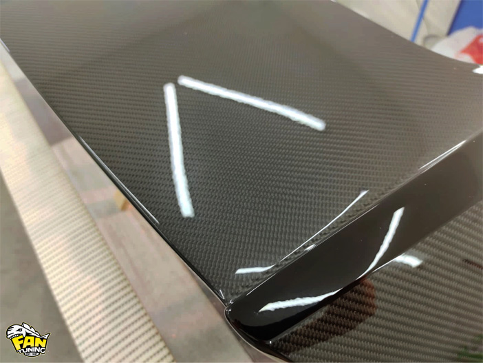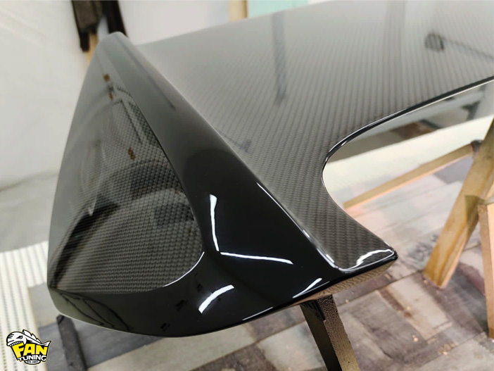 Было два варианта - ламинация спойлера целиком и более интересный - ламинация плоскостей в настоящий карбон, а остальное окрасить в черный цвет. Я очень рад, что хозяин авто выбрал второй вариант, он смотрится намного интереснее.